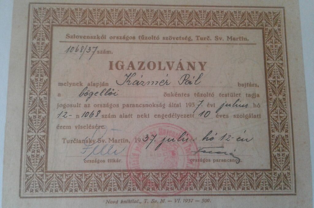 A képen Kázmér Pálnak (1905) az önkéntes tűzoltóságban végzett munkásságáért cserébe kapott 10 éves szolgálati érmének igazolványa.