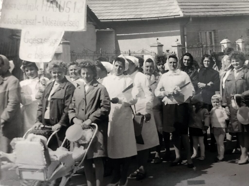 Képen a helyi május elsejei felvonulás látható, pontosabban a helyi Vöröskereszt és a Nőszövetség tagjaival az 1967-68-as évekből. A táblán az „Egészséggel a békéért” felirat olvasható.