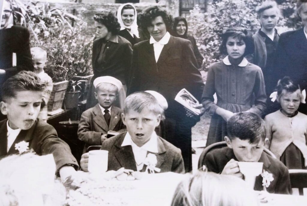 1959 tavaszán az újdonsült elsőáldozók a felsőszeli plébánia udvarán megterített asztaloknál fogyasztják el az ünnepi kakaót és kalácsot. Az asztalnál jobbról Szőcs Tibor, Czafik lászló, ?, mögöttük Szőcs Matild a kislányával, Marikával, ? , Mézes Erzsébet gyermekeivel, Bélával és Erzsivel, Csandal Berta, Csandal György, Hegedűsné, Szabadosné, Taksonyi Rozália és Tánczos Irén. A pap, Kótor András nem látszik a képen.