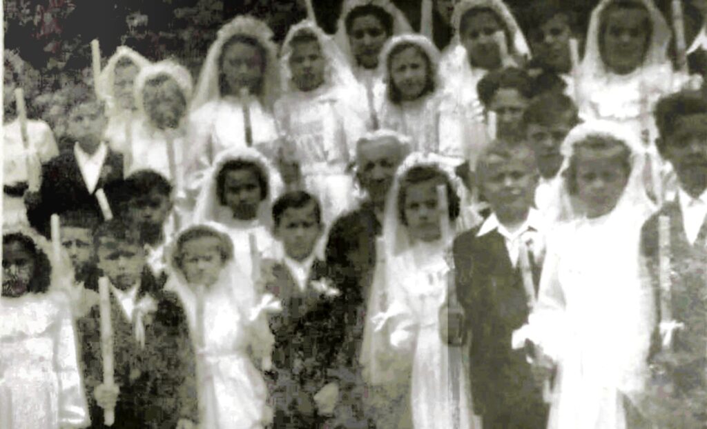 Elsőáldozás 1955-ben a nagybalogi kastély kápolnájában. A tisztelendő úr mellett Bogyó sz. Balázs Éva, mellette jobbra Hodul Gyuszi, mellette pedig Kovács Kati . A képen látható még Báthori Oti, mellette pedig Poznán Ilike.