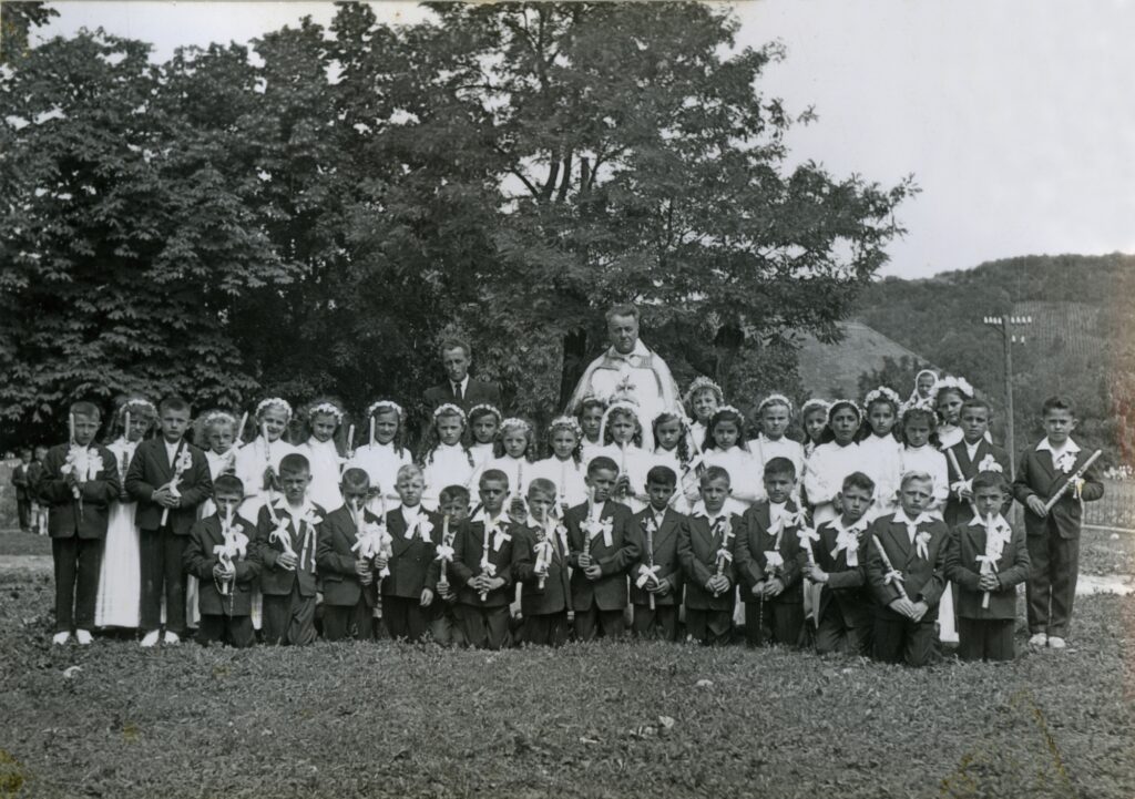 Elsőáldozók fényképe a 20. század ötvenes éveiből (nem lehet későbbi, mint 1960). A felvétel az alapiskola udvarán készült, a háttérben a Mál hegyet látjuk. A képen a gyerekek mögött a helyi tanító és Nýbl László pogrányi plébános állnak.