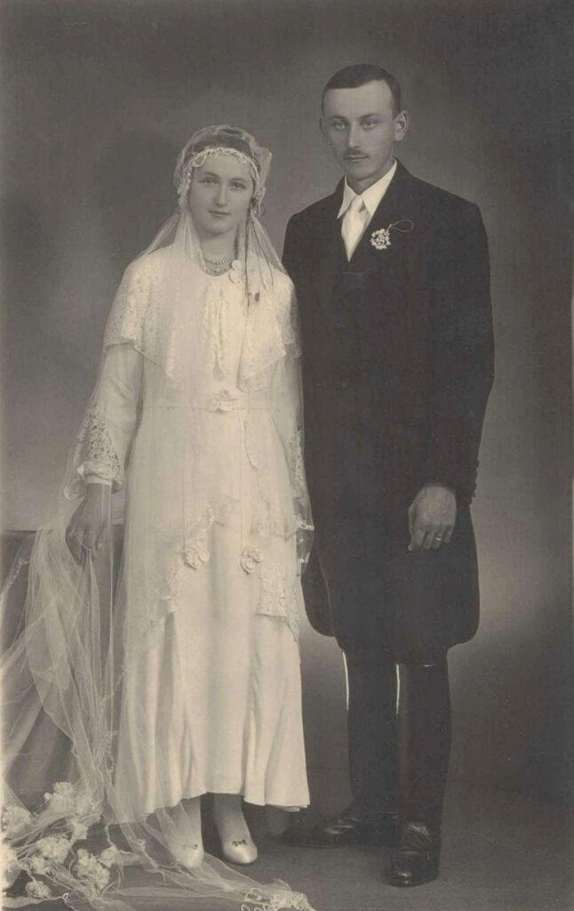 Az esküvői fényképen Nemesradnótból Pósa László és menyasszonya, Bodon Erzsébet látható az 1930-as években.