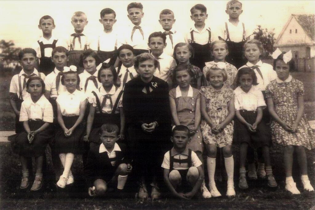 Évvégi iskolai csoportkép Nemesradnóton 1957-ben. Tanítónő: Komlós Manyi.