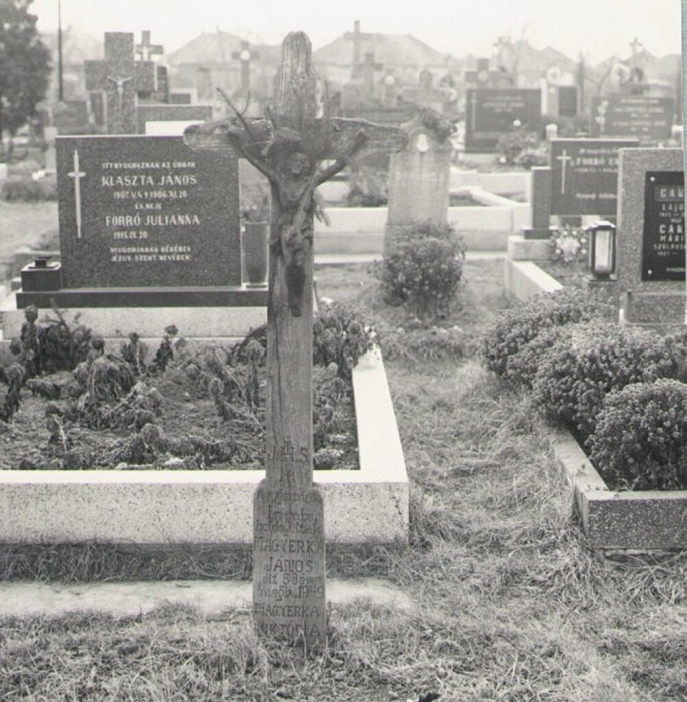 A temetői fafeszület felirata: JHS ITT NYUGOSZNAK ISTENBEN BOLDOGULTAK MAGYERKA JÁNOS ÉLT 83 ÉVET MEGHALT 1949 MAGYERKA VIKTÓRIA…