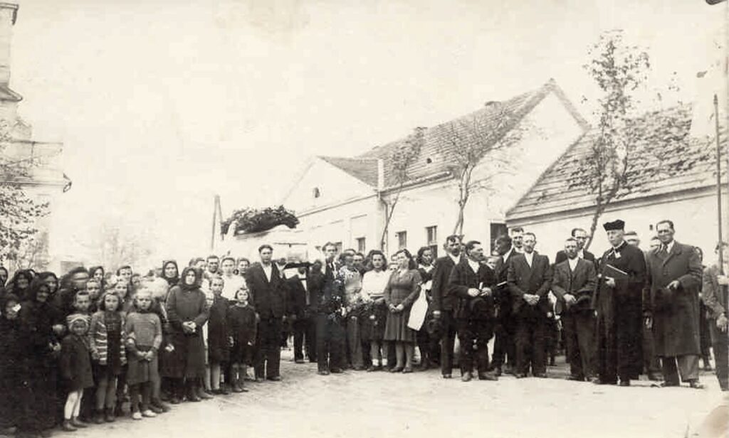 A képen a temetési menet látható, fiatal legényt kísérnek utolsó útjára. Balról a katolikus templom, jobbról a községháza látszik, a menet a fotós kérésére megállt, jobb szélen a kántortanító, Bánszky Jenő, mellette az evangélikus tiszteletes látszik. Továbbá a presbiterek, a világos koporsó és a végtisztességtevők.