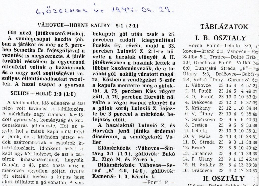 A felnőtt csapat góllövői: a vedégeknél, Semetka és a hazai csapatnál, Puskás György, Lulovič Zoltán 2X, Kiss Károly, Horváth Jenő