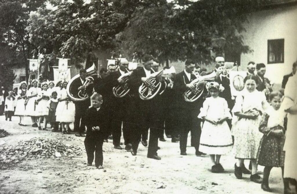 A képen az ismert legrégibb fotó az első helyi rézfúvós zenekarról, amint a Jézus Szíve körmeneten kísérik az egyházi énekeket.