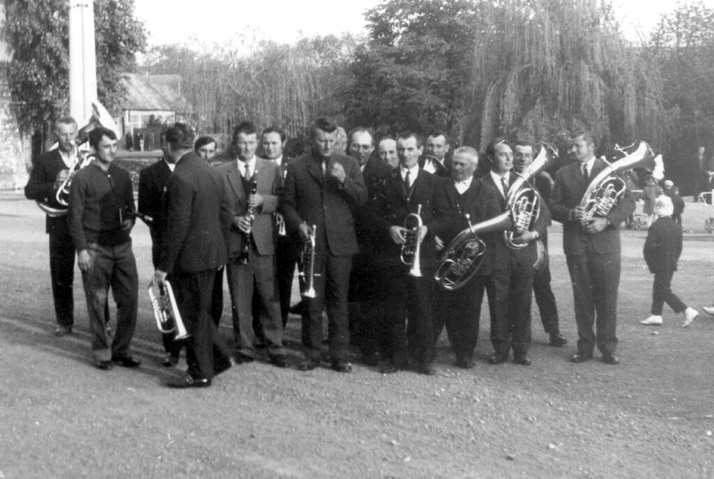 A helyi fúvószenekar a község főterén. A háttérben a hévíztó fűzfáit látjuk, ezek mára eltűntek.