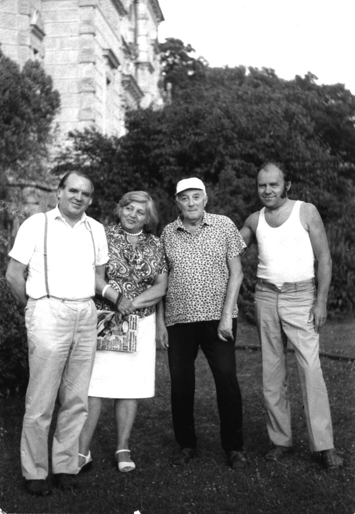 A gidrafai (budmericei) kastély (akkoriban a Szlovák Írók Társaságának alkotóhelye) előtt: Dénes György, Ordódy Katalin, Egri Viktor, Duba Gyula.