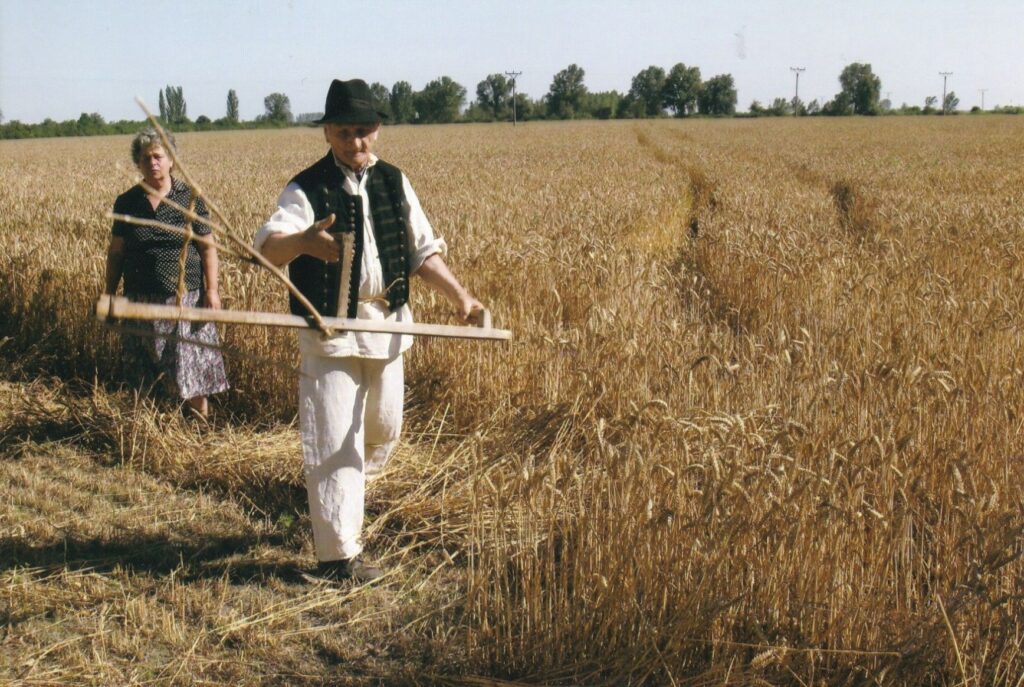 A hagyományok felelevenítése céljából több alkalommal megrendezésre került a hagyományos aratás bemutatása. Ezen alkalmakkor a fiatalok meg tudták ismerni és fizikailag ki tudták próbálni a régi betakarítási módot. A képen háttérben Vida Sándorné, született Beke Eszter.