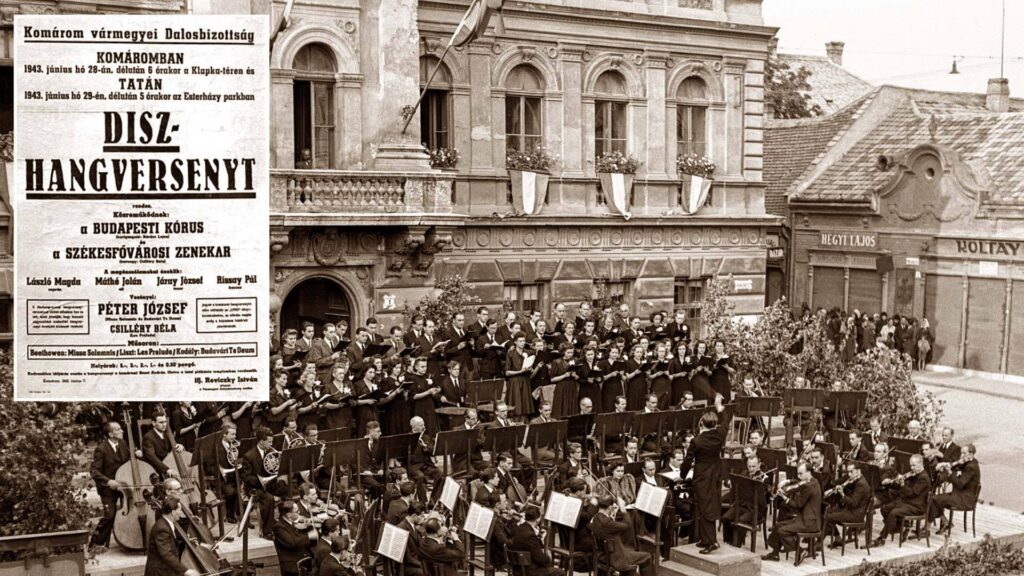 A hangversenyre 1943. június 28-án 18:00-kor került sor a Klapka-téren. Közreműködött a Budapesti Kórus és a Székesfővárosi Zenekar. A rendezvényt a Komáromi Vármegyei Dalosbizotság szervezte. A fotót a Felvidéki Zsiványok csapat gyűjtötte a Felvidéki értékverseny során (Forrás: Gráfel Lajos gyűjteménye).