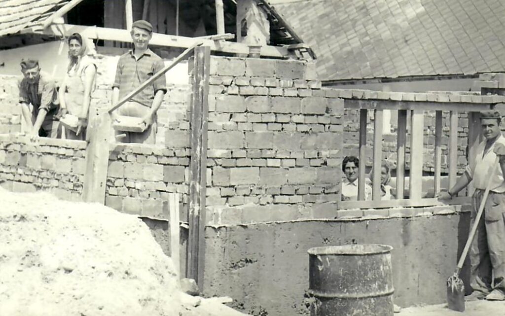 A képen házépítés látható. Abban az időszakban faluhelyen a házakat kalákában építették. Ez kép 1968-ban készült. A képen Csókás Matild, Oszlík Géza, Csókás Erzsébet és Csókás Sándor munka közben.