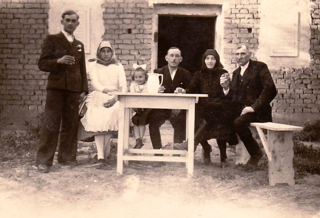 A fényképen Dékany János (szül. 1893), Julianna (szül. 1904), Dezső, Margitka és Elek (szül. 1923) látható a borházsoron – hajloknál üldögélve.