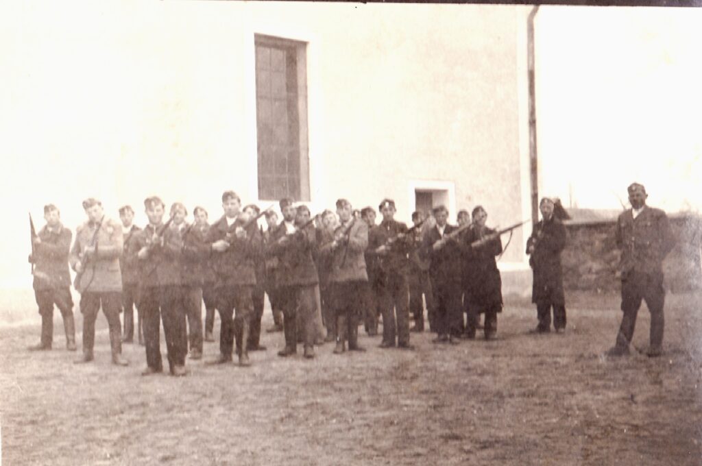 A fényképen a hetényi leventék a templom mellett 1942-ben gyakorlatoznak. A kép hátterében a templom eredeti kőkerítése az 1700-as évekből.