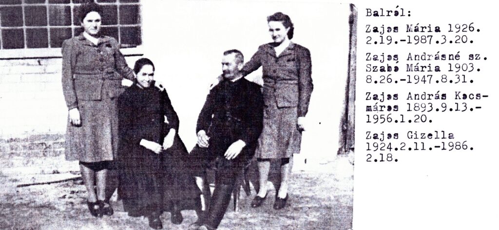 Zajos család (balról): Zajos Mária (* 1926. 2. 19. † 1987. 3. 20.), Zajos Andrásné sz. Szabó Mária (* 1903. 8. 26. † 1947. 8. 31.), Zajos András kocsmáros (* 1893. 9. 13. † 1956. 1. 20.), Zajos Gizella (* 1924. 2. 11. † 1986. 2. 18.)