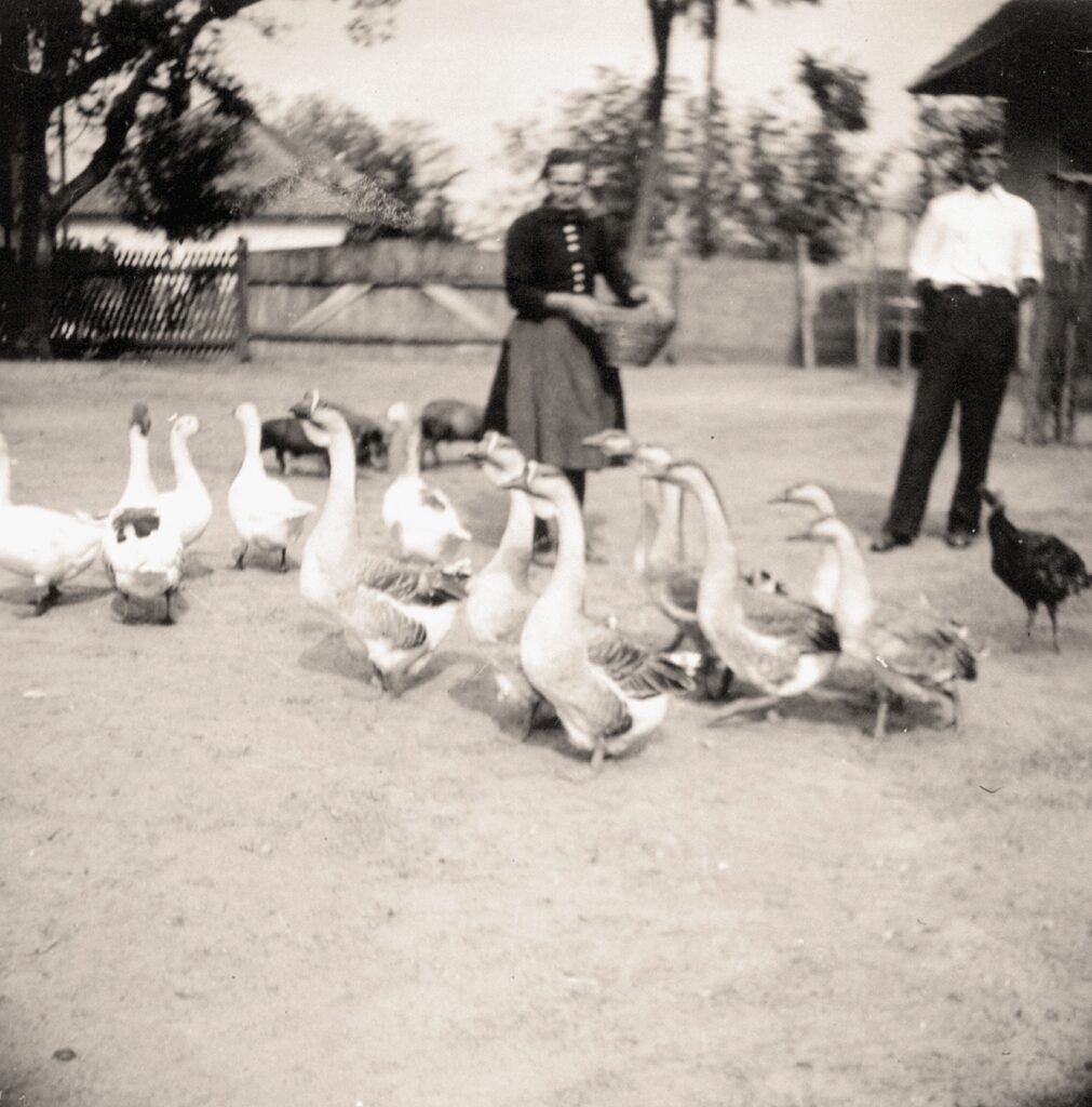 A fényképen a leventelegény Kocsis Dezső az édesanyjával látható, amint a hetényi ház udvarán a libákat etetik. Valószínűleg a deportálás előtti évben készült.