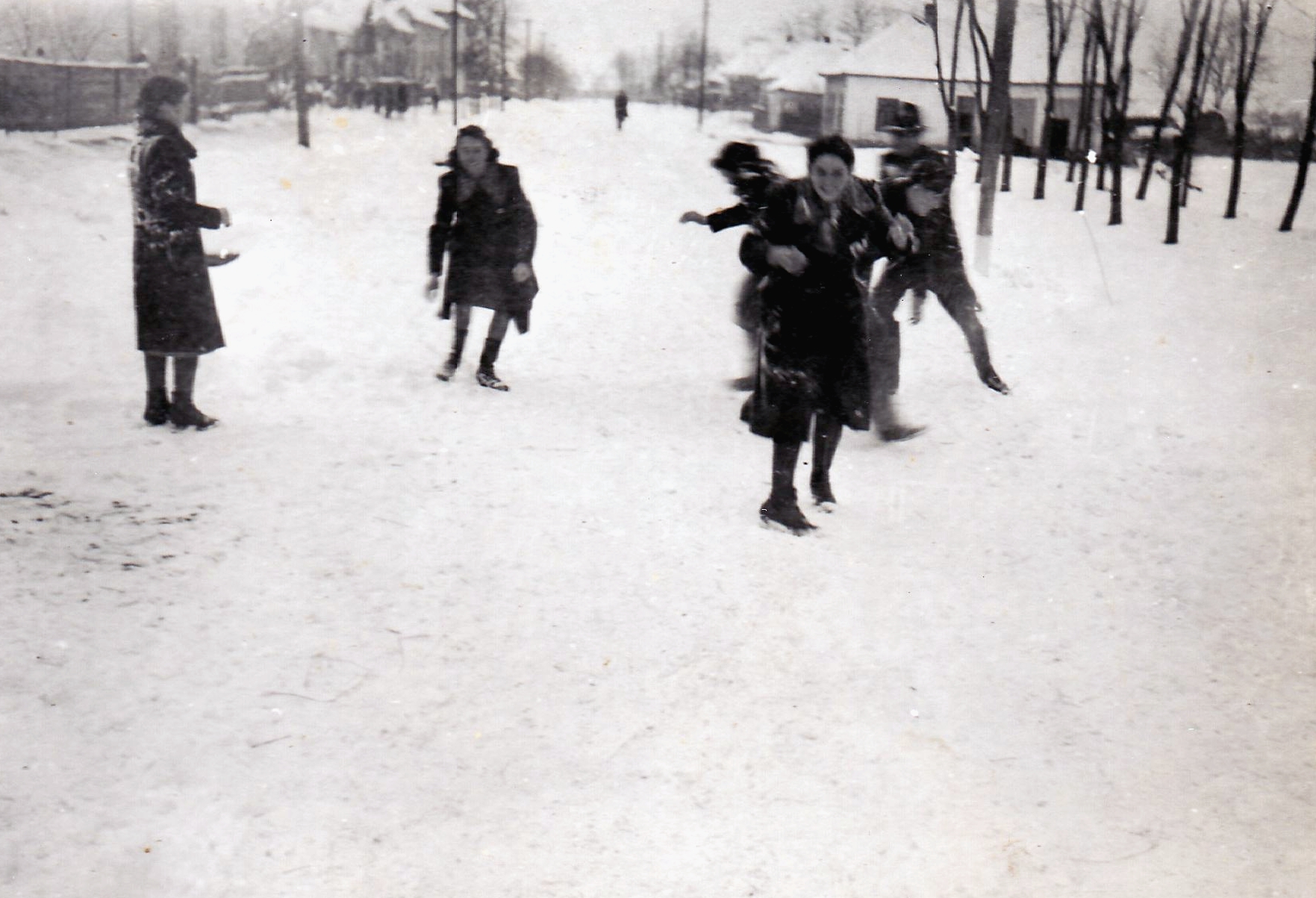 Az 1940-es években Hetény főutcáján a tél közepén a Zajos lányok is hógolyóznak.