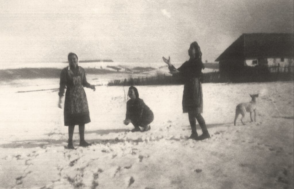 Hógolyózás Nemesradnóton. Három a kislány: Sproho Gizi, Jano Valika, Péntek Irén.