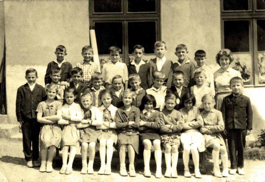 Iskolai osztálykép a falu központjában álló régi iskola épülete előtt (ma az épületben szórakozóhely működik).