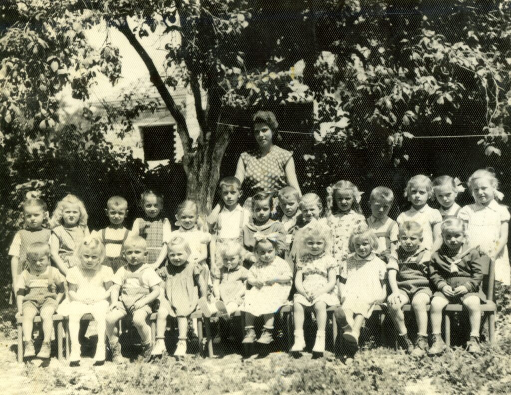 Iskolai osztálykép, háttérben a felújítás alatt álló iskolaépülettel.
