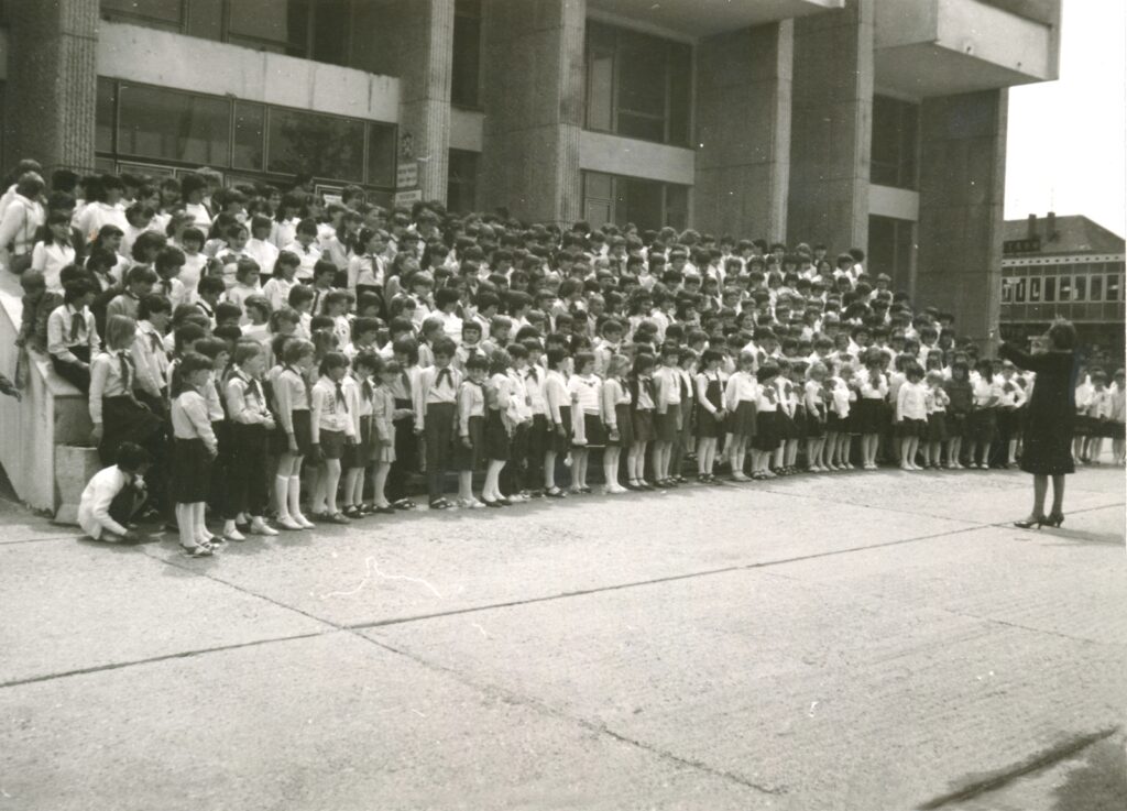 Az iskolai énekkarok seregszemléje után az összkar a Dunaszerdahelyi Városi Művelődési Központ előtt