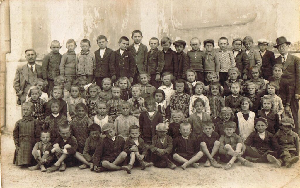Kőhidgyarmati iskolások csoportja. A kép jobb oldalán Kónya József igazgató-tanító, bal oldalán Szoleczky János tanító.