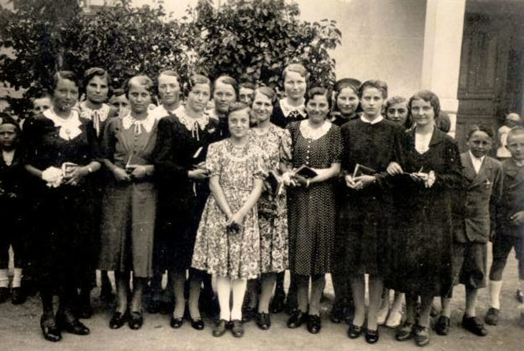 Nemesradnóti fiatalok énekeskönyvvel a kezükben az istentisztelet előtt. Köztük Pósa Katalin, Bodon Gizella, Varga Jolánka, Pál Irén és Pál Aranka.