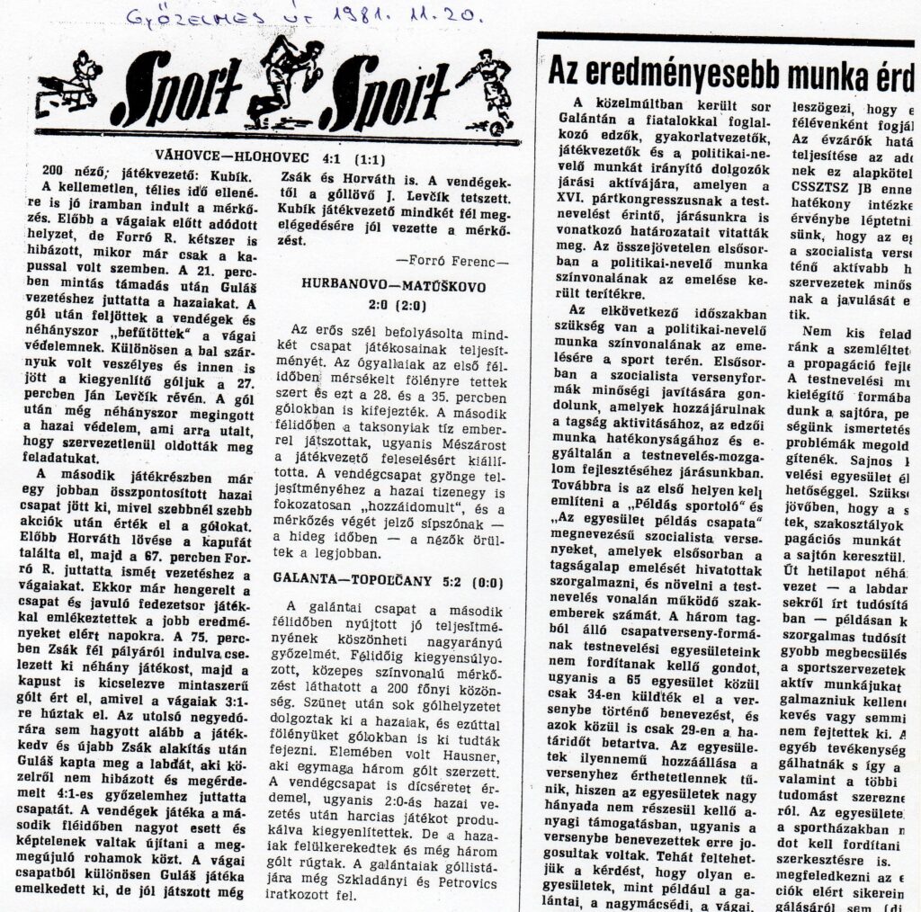 Gólszerzők: A hazaiaknál Guláš Rudolf (2), Forró Róbert (1), Zsák (1), és a vendégeknél Levčík Ján volt eredményes