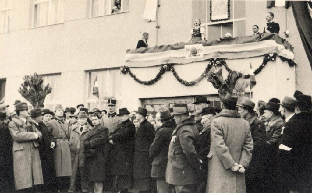 Józsa Editke az iskola erkélyén, a Horthy-korszak három soros “nemzeti imáját” a Magyar Hiszekegyet szavalja.