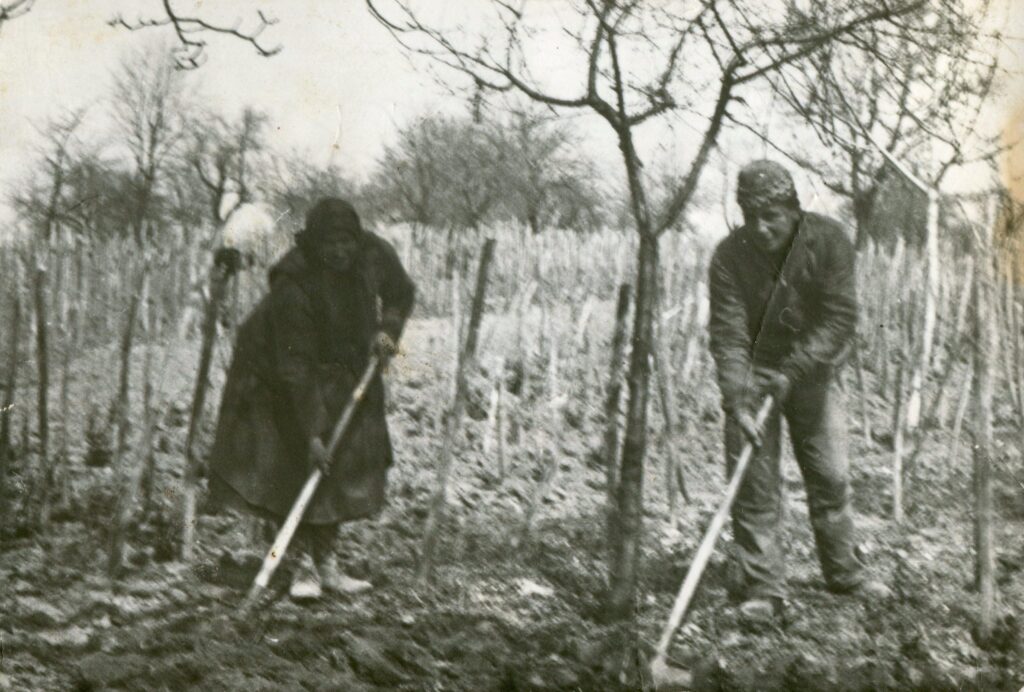 A szőlőhegyi munkák egyik legnezebbike a kapálás volt, a „nagykapával” végzett munka helyettesítette az ásást. A képen viszont könnyű tavaszi-nyári kapálást látunk.