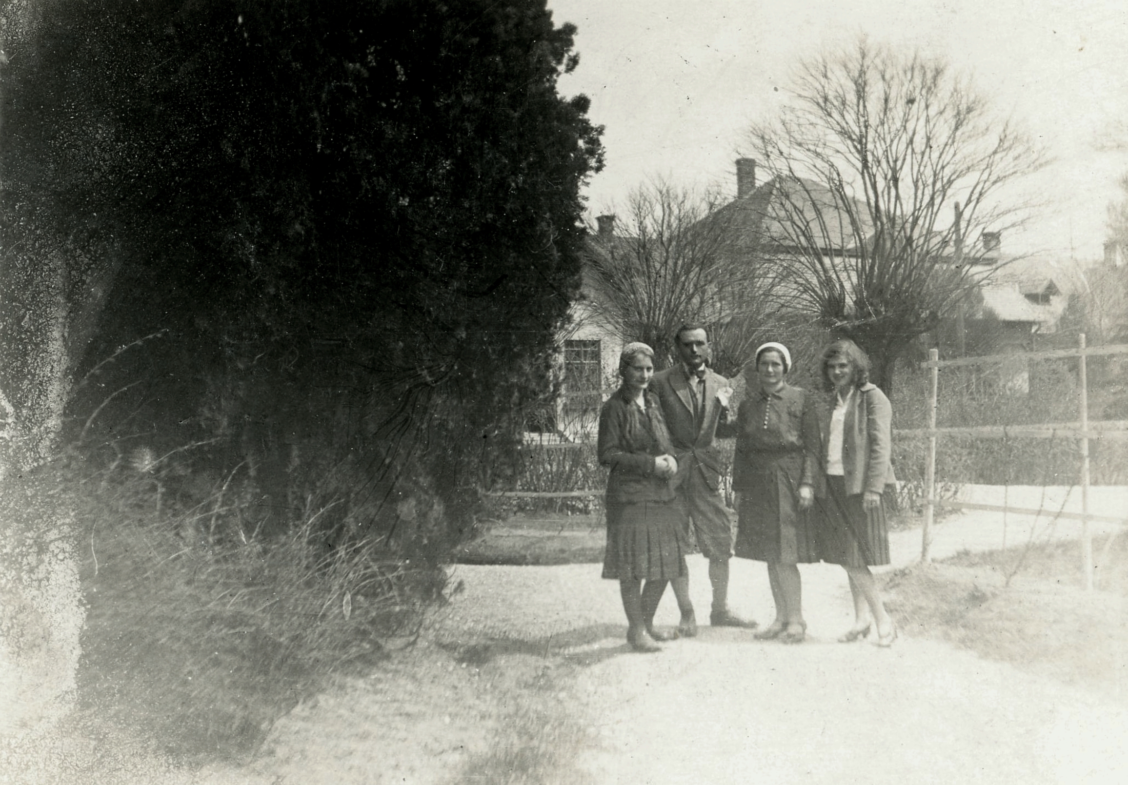A karvai Nepomuki Szent János szobor mellett, a hársfáknál a férfi Török Pista, mellette jobbra Varga Manci, és barátaik.