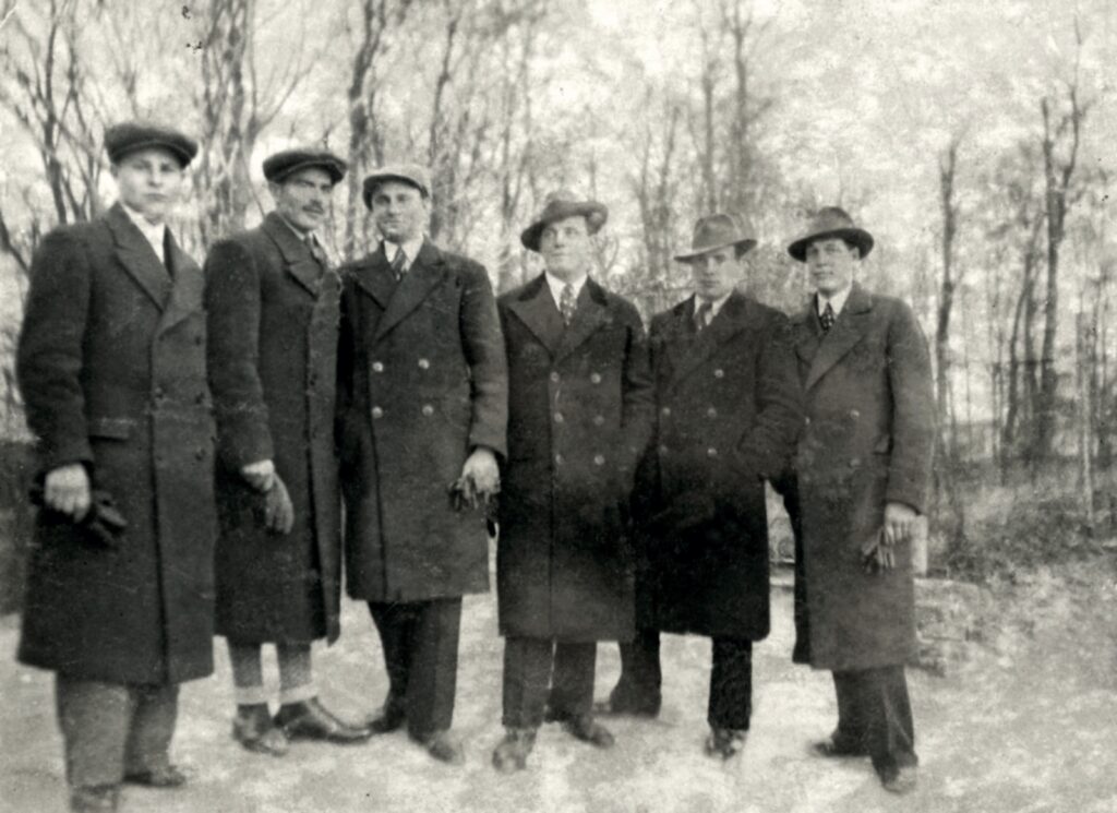Balról a második Csókás János, mellette Zsapka xxx (Zsapka Ferenc apjának testvére), jobbról a második Pollák István, ünnepség előtt egy közös képen a „Barina” falurészen.