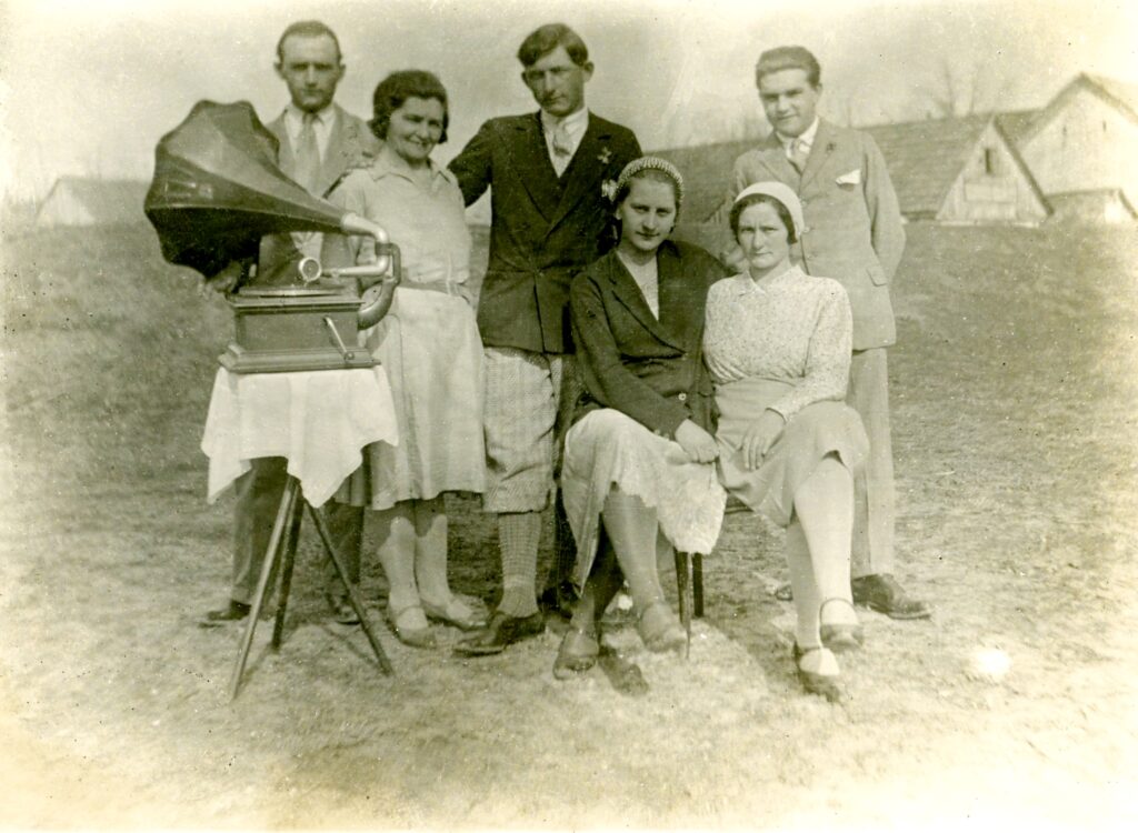 A képen Gunics János a Duna Filmszínház tulajdonosa (Gunicsné Kovács Lina fia, későbbi Palkovicsné), Manci néni, barátnője, Sabla Tyatya, Muca néni, Török Pista bácsi és a gramofon, a Markó-háznál.