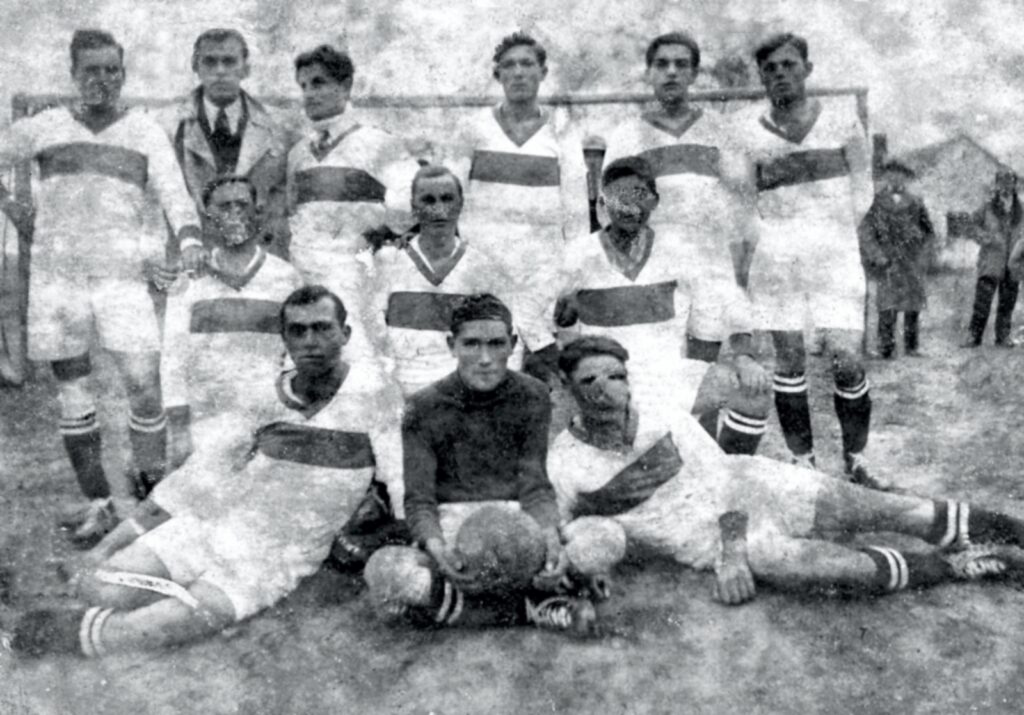 Karvai futballisták, kitűnő csapat, középen a kapus Szűcs Pista, jobbra Zsíros István, jobb oldalt áll Sabla József („Tyatya”).