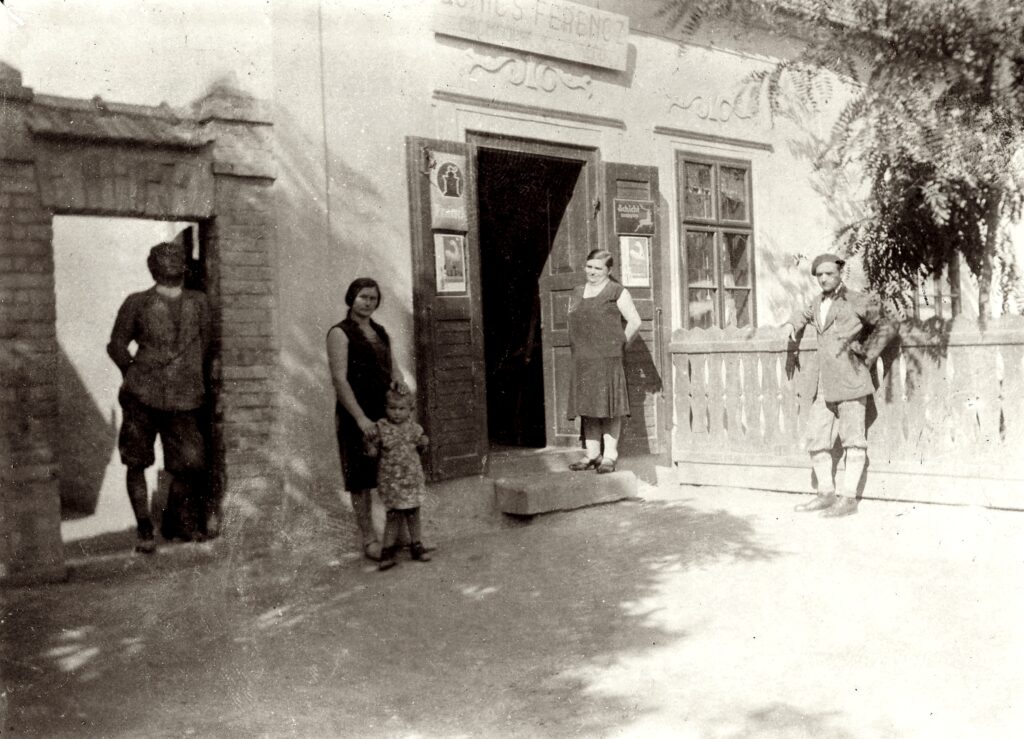 A karvai Tulipán utcai Veszna „bót” és a mellette lévő kocsma előtt balról Sabla József („Tyatya” szül. 1914), Varga Manci, kislánya Bözsike, Palkovics Lina néni (első férje Gunics) és Török Pista, 1930-ban.