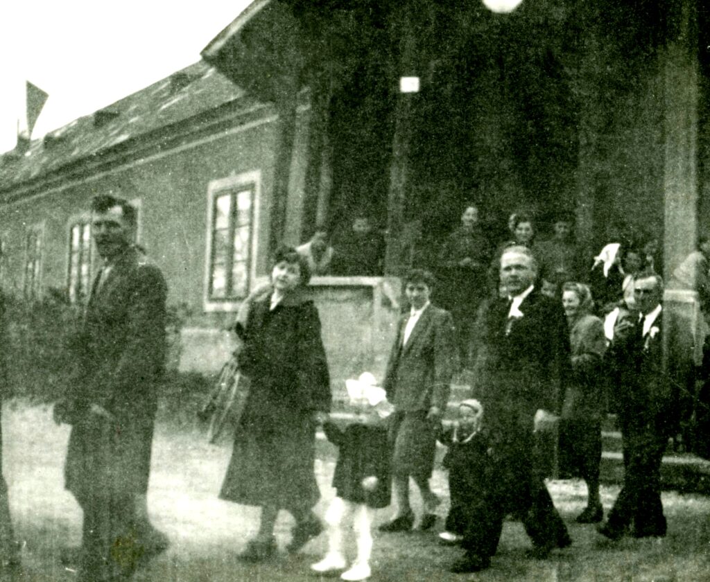 Sabla Irén és Psenák József lakodalma. Elől a vőlegény bajcsi rokona, mögötte Vidráné Mihalik Bözsi, gyermekével, mögötte Kácserné Mihalik Magda gyermekével Stanoval, Mráz Pista bácsi és Ilcsi néni. A lakodalom több száz személyes volt. A családi ház nagy kertjében volt felállítva a sátor, melynek hossza a kert hosszával egyezett meg.