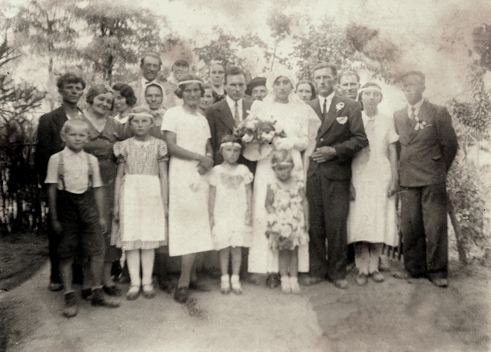 Pálinkás Irén és Sabla József (Tyatya) esküvője, 1936-ban, a menyasszony mögött Pollák Imre.