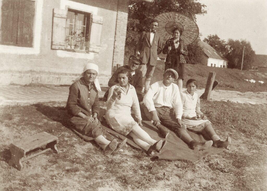 Mázsaház a Duna parton Karván. A háttérben a Tulipán utca végén lévő Markó ház, a másik ház az 1990-es években leégett. Napernyővel a kezében Varga Manci, Török Pista, elől balról a hölgy és a férfi a mázsaházban laktak. Muca néni eszi a szőlőt, mellette Sabla József („Tyatya”), XX, 1933-ban.