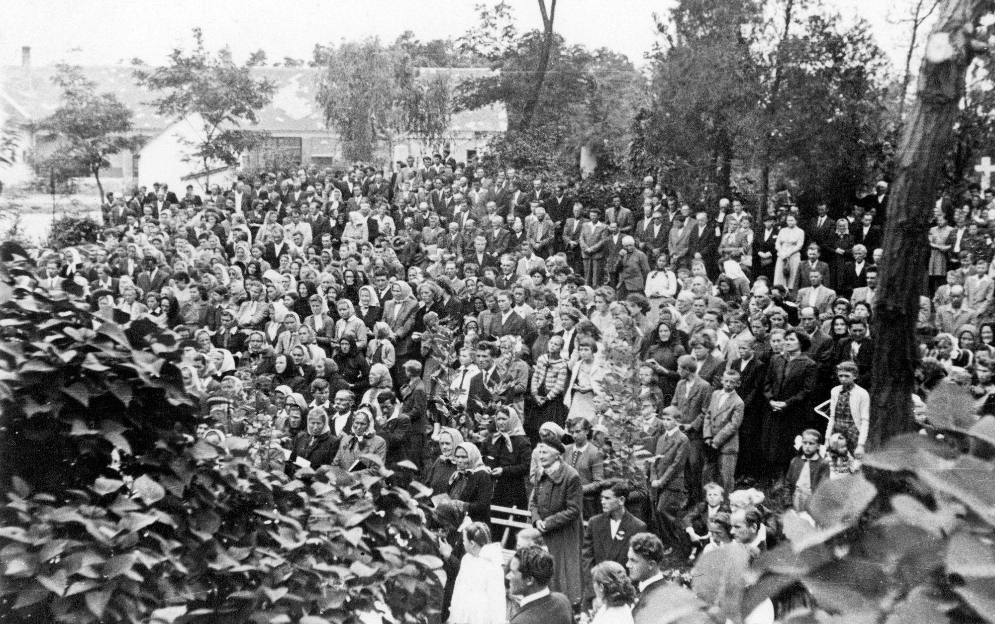 Bartal Károly Tamás, karvai születésű (szül.1937) jászói premontrei prépostság nyugalmazott apátjának pappá való szenteléséről készült fénykép. Az eseményre 1957. június 21-én, Karván került sor. A háttérben a Hroššó-kúria még jó állapotban lévő épülete látható.