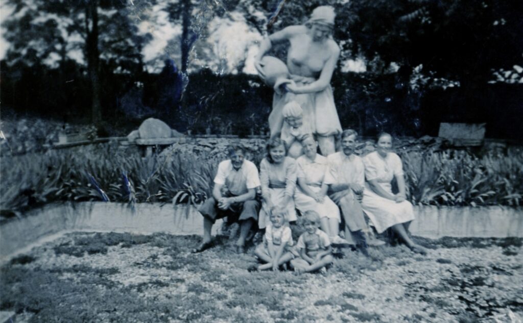 Balról Gulyás Sándor, XXXX, Hegedűsné Fehér Mária Magdolna, Psenák István, Legárdné Fehér Mária, gyerekek XXXX, a Szarvassy parkban. A háttérben látható szobrot Kuzmik Lili férje készítette. Kuzmik Lili édesanyja (Kuzmik Pálné) és dr. Szarvassy Imre testvérek voltak.