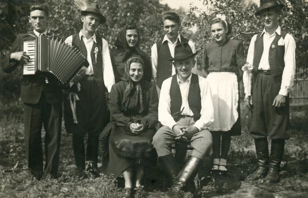 Ülő sor Simcsik Dezső, Jezsó Anna, jobbról áll Virág László, Pollák Emília, Polozsányi András, Török Zsapka Erzsébet, Finta Emil, harmonikás Kajanovics Ottó.