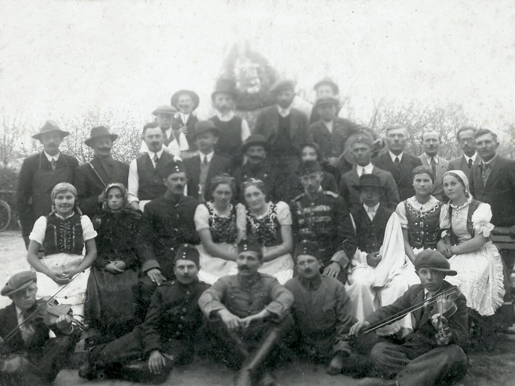 A karvai színjátszók valamikor az 1938-as években, valószínűleg a Katóka őrmester darabot adták elő. Háttérben a szereplők mögött a magyar címer.