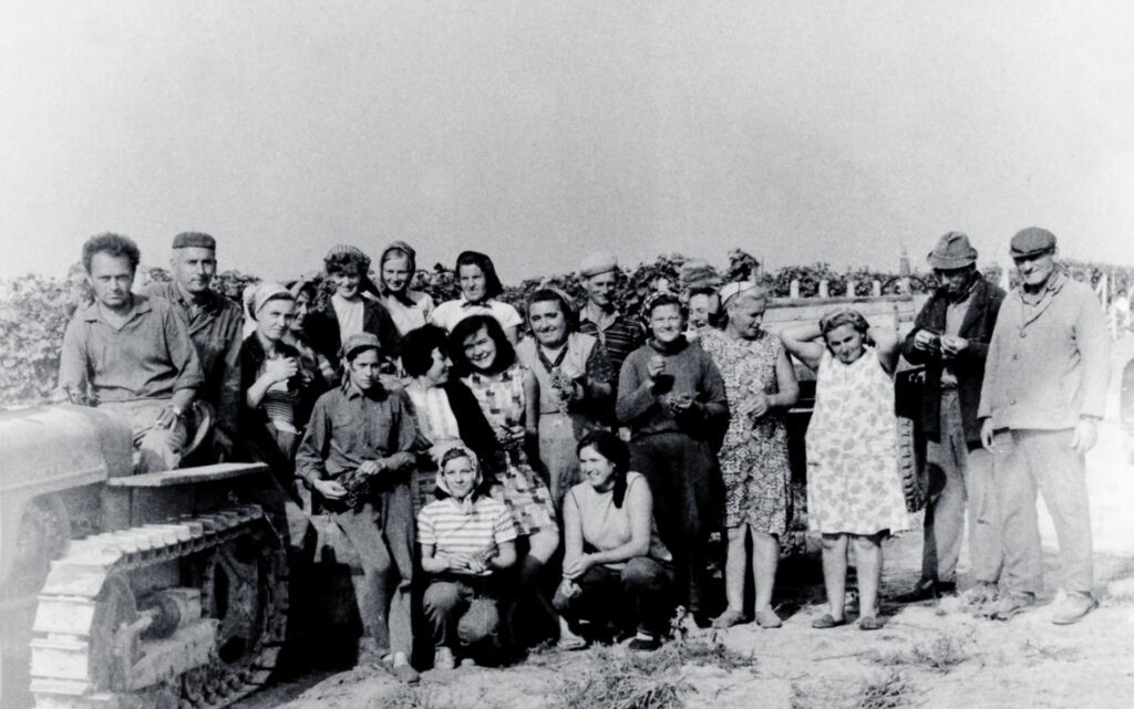 A karvai szövetkezet (JRD) szőlész csoportja, balról Bugány József, Kakula Károly, Zsírosné Gregó Irma, Csermákné Farkas Róza, Senkárné Domin Erzsébet, Blahovicsné Gerencséri Anna, Bugany Magda, Hajdú Gyula, Győző Irma.