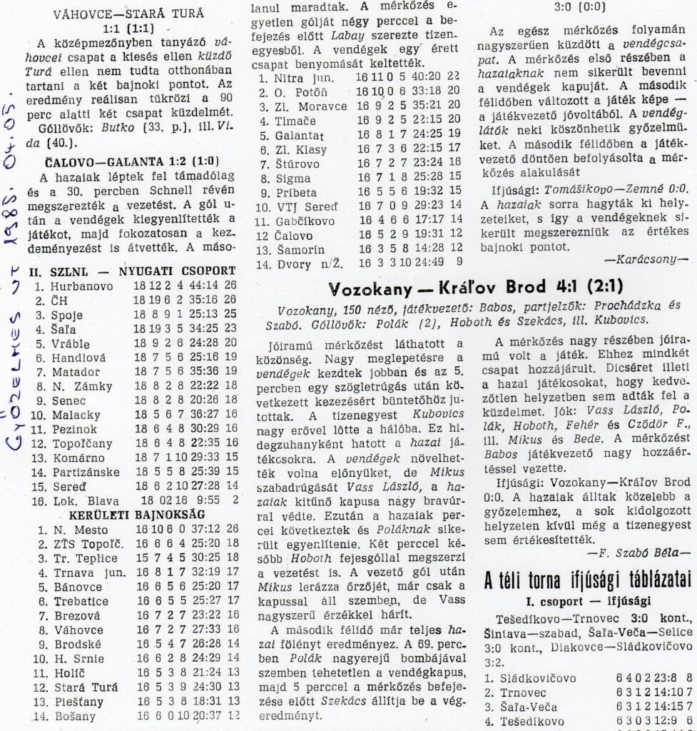 Akkor még 2 pont járt a győzelemért s 1 pont a döntetlenért. A vágai csapat a Kerületi Bajnokság 14 focicsapata közül a 8. helyen állt.