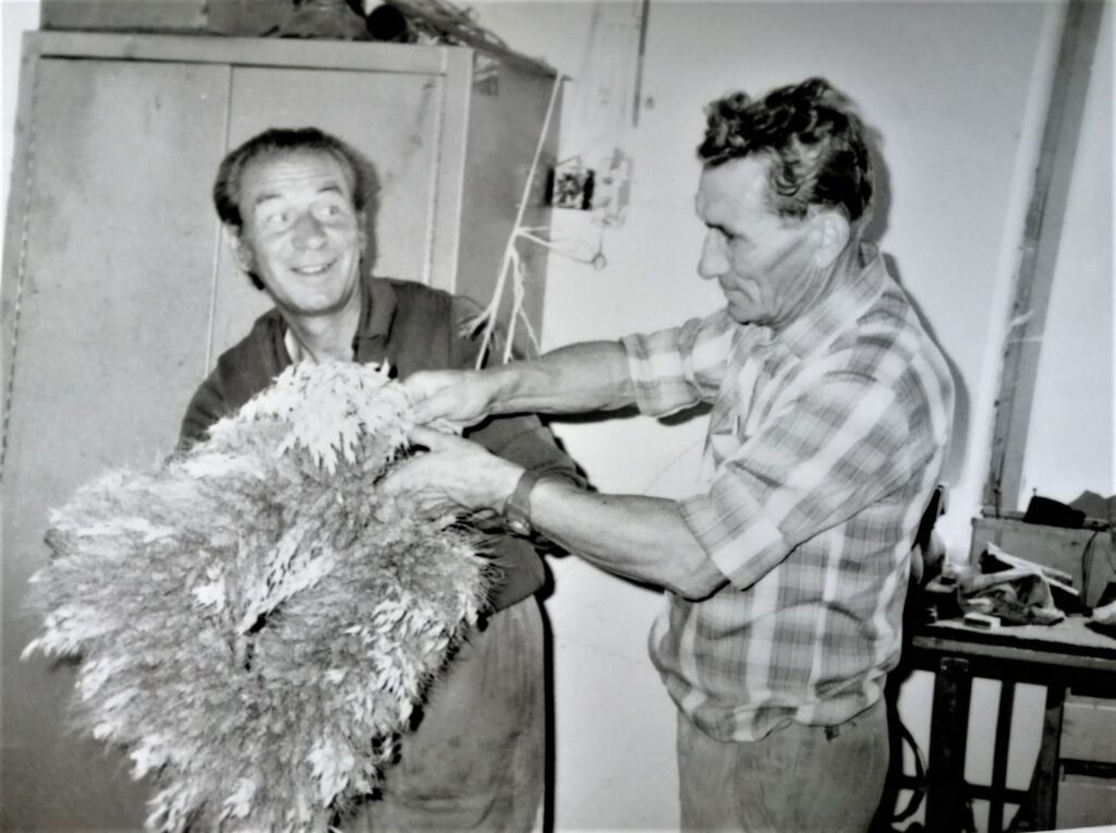 Hegedűs Mihály, a koszorú készítője, balra tőle a sógora, Kázmér Miklós látható.
