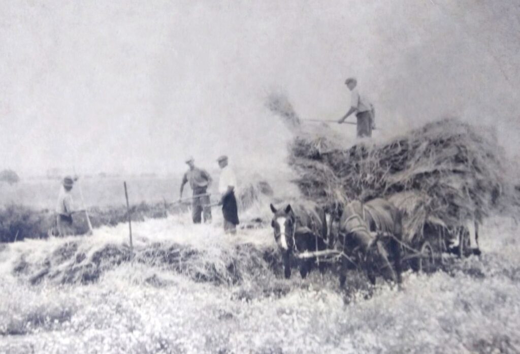 Nagybalog, kéveszedés, 1947. Aratáskor a gazdák udvarába hordták a kévéket, a csűrbe.