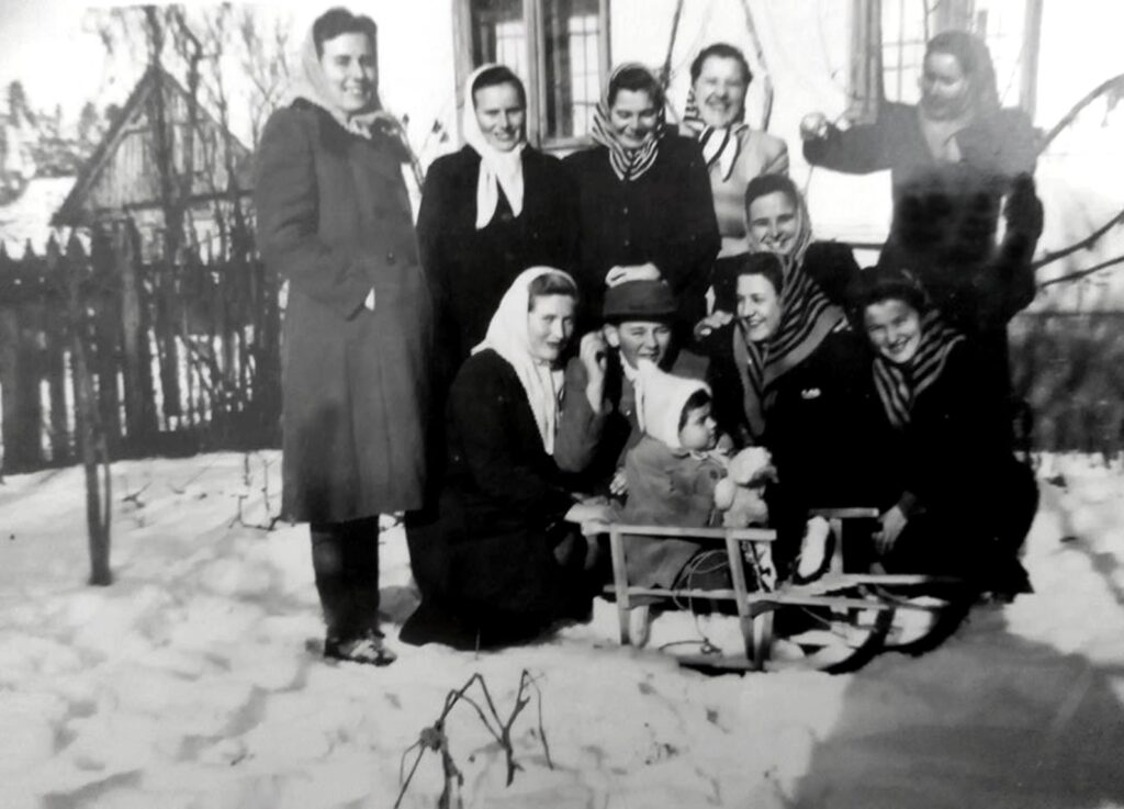 A képen a szánkóban Bogyó sz. Balázs Éva látható 1949-ben Nagybalogon édesanyjával és a varrni tanuló lányokkal.