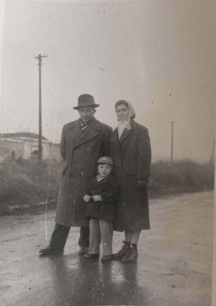 A fényképen dédnagyapám családjával látható az 1950-es években. A kép valószínűleg a vár bejáratánál készült. A család korabeli, hétköznapi viseletben áll a kamera előtt: a férfi kalapot és hosszú kabátot visel, a nő fejkendőben és szintén hosszú kabátban látható, a kisfiú pedig sapkát és kabátot hord. A fotó hitelesen megörökíti az időszak mindennapi öltözködését és városi hangulatát.