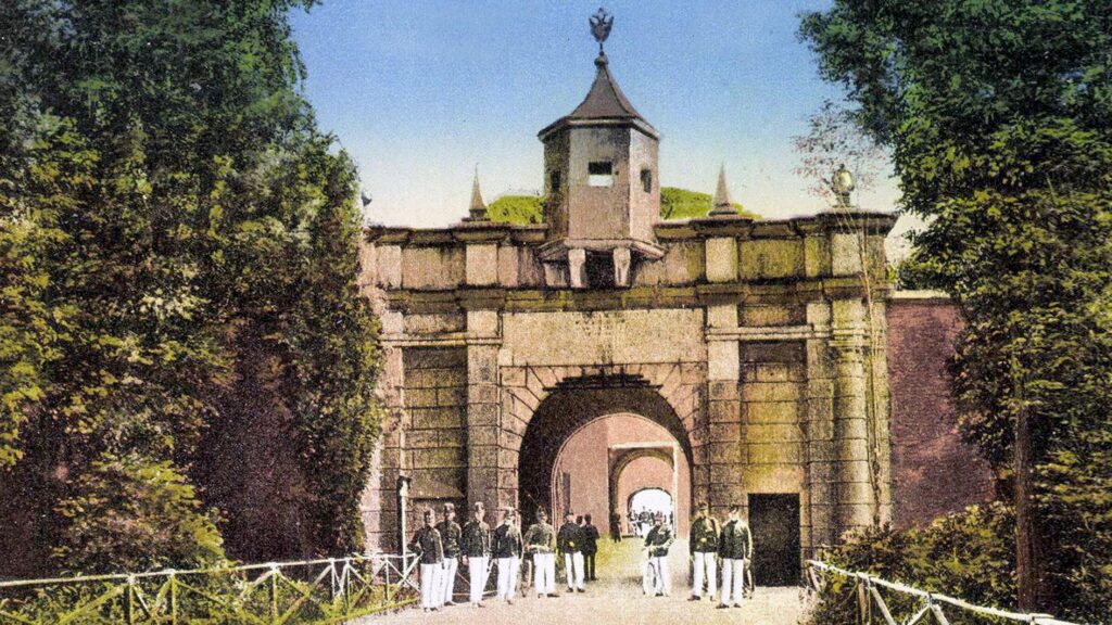A Lipót kapu az úgynevezett Újvár (Neue Festung) bejárata. A kőtábla alapján ezt a részt Habsburg Lipót uralkodása alatt építették 1663-1673 között. A képeslap fényképe a 20. század elején készült, amikor az Osztrák-Magyar Monarchia katonái szolgáltak az erődben.