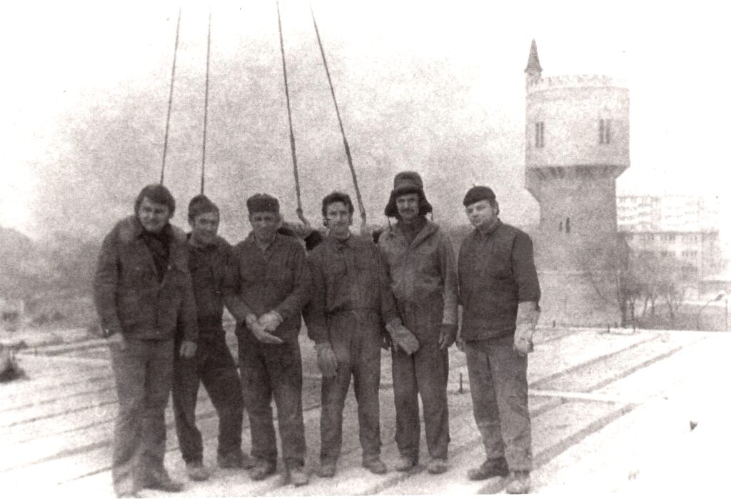 Tetőn állva, a hidegben dolgozó csapat. Kép adományozója Bödők Dénes (szül. 1944).